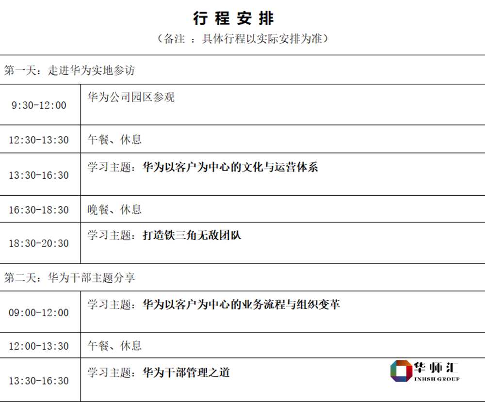 走进华为:向奋斗者学习企业管理 / 产品体系, 国内外标杆游学 / 作者: Wu 走进华为:向奋斗者学习企业管理 Introduction to Huawei 为什么要学习华为?2019年5月21日华为创始人任正非接受国内媒体集体采访,在华为提供的资料中,有这么一张图片: 2020年5月15日,美国商务部加大了对华为的限制。5月16日华为心声社区发文,还是这张图片,还是这行文字,在内文中表示“回头看,崎岖坎坷;向前看,永不言弃”。 2022年8月,任正非先生说:未来三年,先活下来!把寒气传递给每个人。 2025年6月,任正非先生说:不去想困难,干就完了!一步一步往前走。 华为这个奇迹的出现,并没有追随什么风口,没有发明任何新的商业模式,没有喊出任何语惊四座的颠覆性口号。但是,华为的奇迹是有其内在的逻辑。其最大特点就是始终坚持常识思维,尊重常识,敬畏常识;尊重市场,敬畏市场;尊重客户,敬畏客户。 华为游学行程具体方案,请联系我们!全国服务热线:400-0755136
