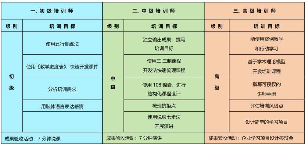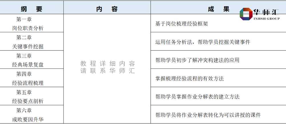 内训师专题 / 企业培训及辅导 / 作者: 管理员 STT内训师全套课程体系© Skills Trainer Training© 初、中、高级课程简介 STT培训效果模型 STT企业培训师快速提升© Skills Trainer Training© 【课程对象】企业内部培训师【推荐课时】1-3天【课程优势】经典TTT是基于50年代的认知主义思维,研究如何灌输理论,经常把“培训技能”误解为“演讲能力”,企业的需求和传统TTT之间的距离越来越远。 STT®结合当代员工的实际需求,通过精益化的训练设计,让每位学员能在课堂现场立即转变台风,并在极短的训练时间内完成多次课程开发练习。立竿见影的效果,使STT成为越来越企业内训师共同的选择。 【培训大纲】一、玩转台风:把课堂翻过来二、玩转课程:培训内容定位的四要素三、玩转控场:职业控场四、玩转案例:培训变得有血有肉五、玩转课件:企业课件标准化 STT岗位经验萃取© 【课程背景】 企业中常常出现这样的现象:资深员工的离职意味着其所积累的经验和教训也都被带走,新进的员工到岗后要从头再来;一个部门的经验没有汇总整理,每个人都要从头成长,好经验没有得到有效推广;工作中出现的问题重复多次培训,但没有梳理出来,不能在过去的经验积累上持续成长。企业最大的浪费就是经验的浪费! 本课程将全程引导学员从经验主义的模式,发展出反思、复盘、整理、升华的技能,并能将自身经验转化为可见的材料,用最低的成本实现组织经验在内部的传承。【课程安排】 课程详细资料,请与华师汇联系。 全国服务热线:400-0755136